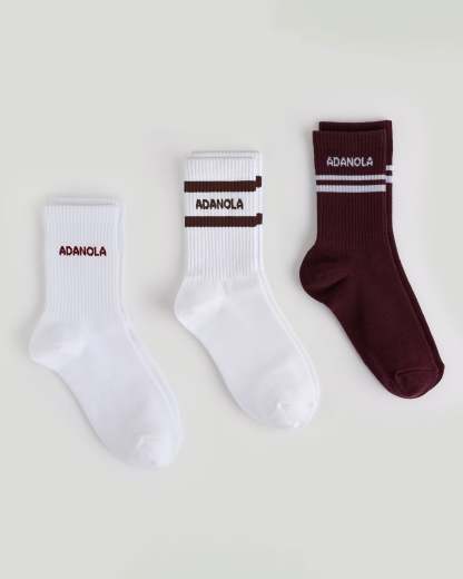 3 Pack Multi Branding Socks? Because one pair just isn't enough. The socks are made for everyday wear. Style with your Adanola set to complete the look. A pack of three available in White and Dark Cherry.