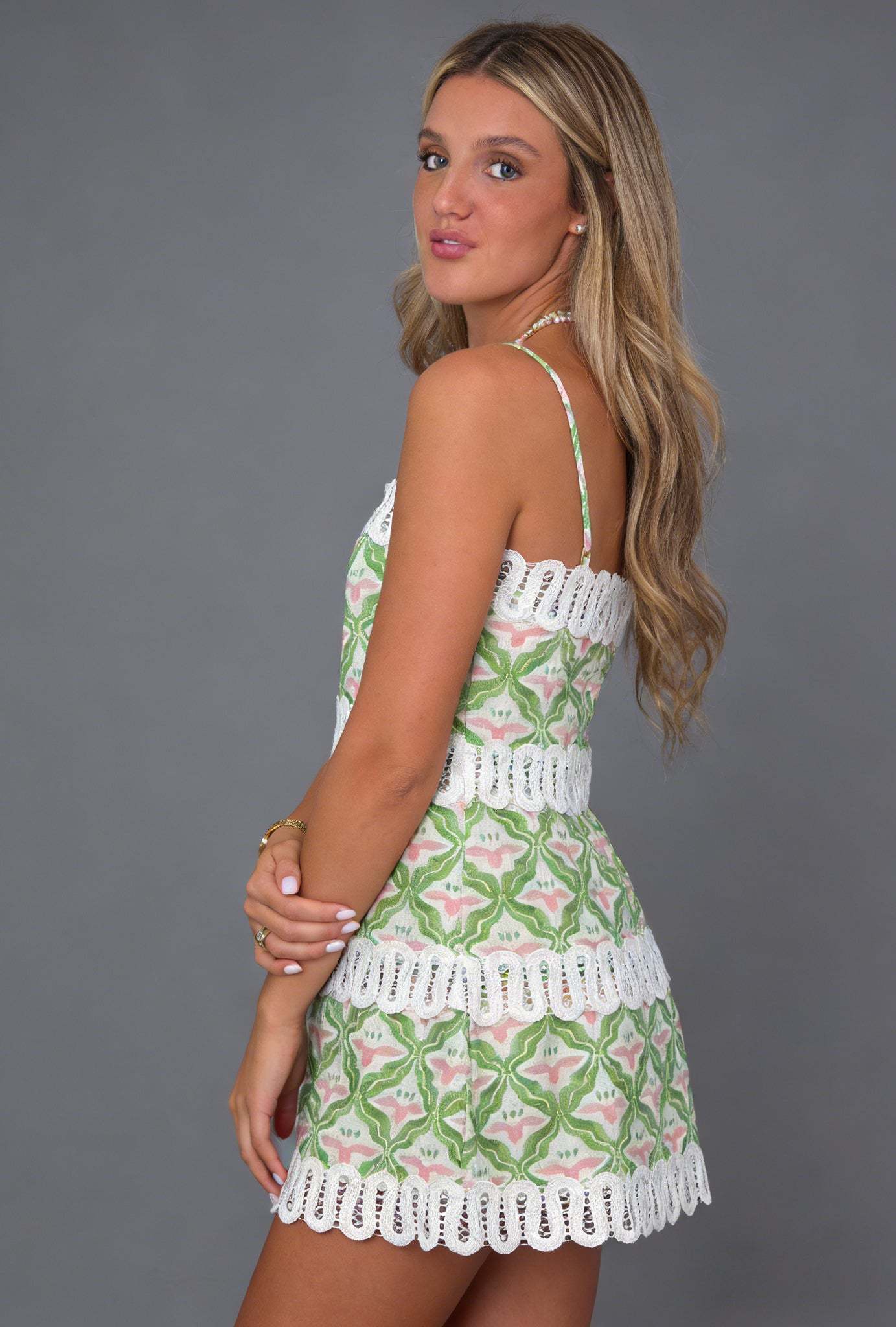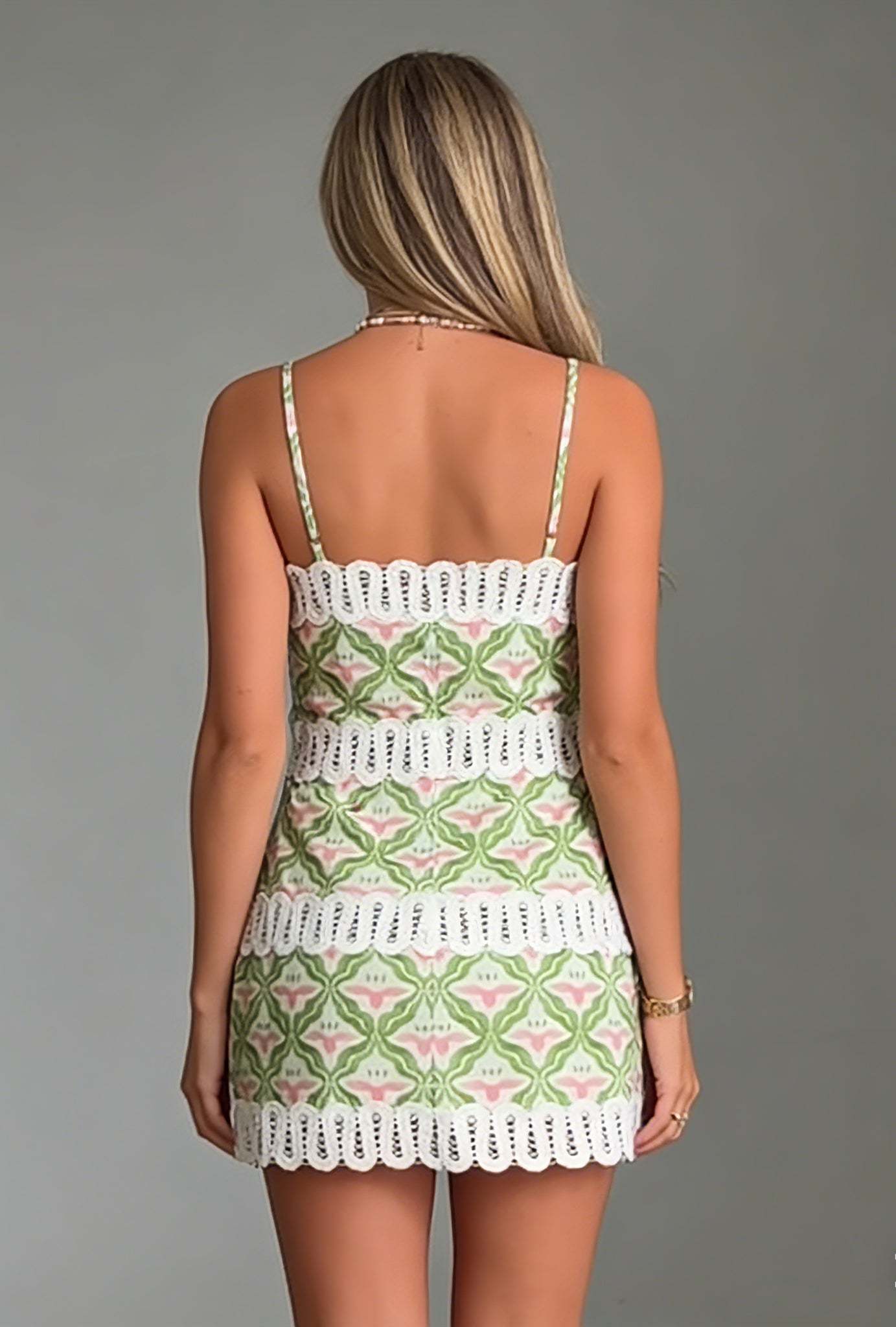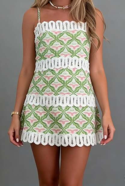 Bright and cheerful, this mini dress features a pink and green floral print with bold lace trim accents. The flattering fit and lightweight fabric make it perfect for sunny days, brunch dates, and summer getaways.