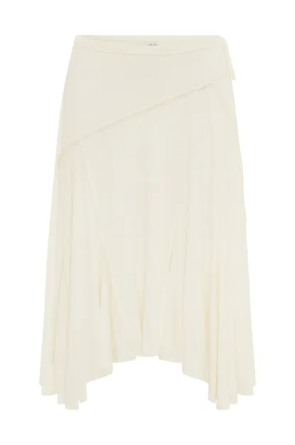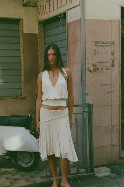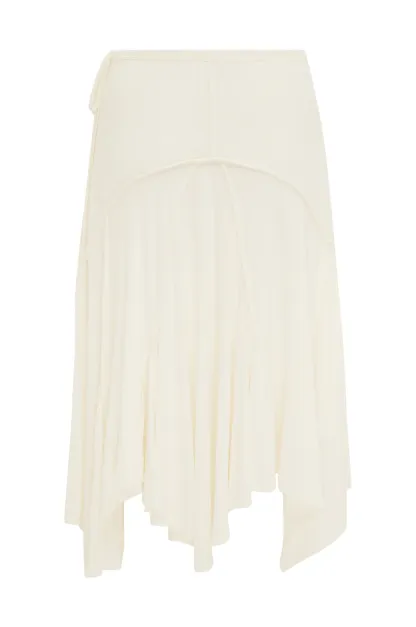 Soft, flowing, and effortlessly elegant. The Ivory Halo Asymmetrical Midi Skirt features a high-rise waist with an airy, irregular hemline that adds movement and charm. Perfect paired with the matching halter corset top or styled alone for modern sophistication.