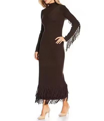 Mock Neck Fringe Maxi Sweater Dress