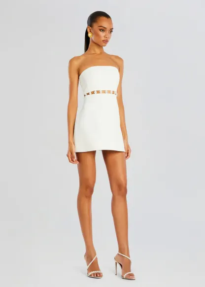 Pure romance. This white strapless A-line mini dress features a waist cut-out framed with delicate pearl detailing for a soft, feminine glow.