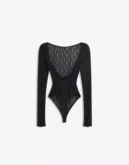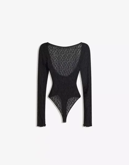 Sleek with a daring edge. This black mesh bodysuit features a sheer finish, open-back design, and a lined bust for confident coverage. Perfect for nights out or statement layering.