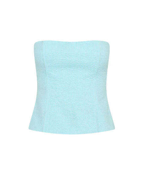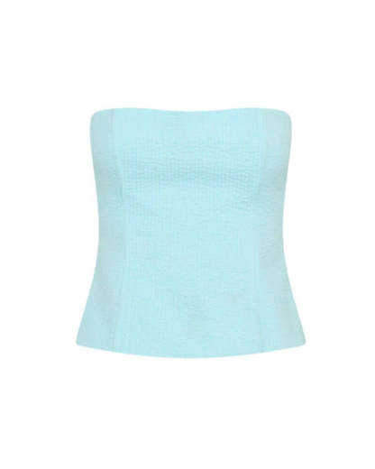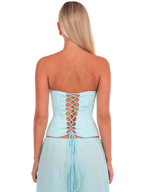 A structured strapless corset top with a cinched waist and adjustable lace-up back for a custom fit.