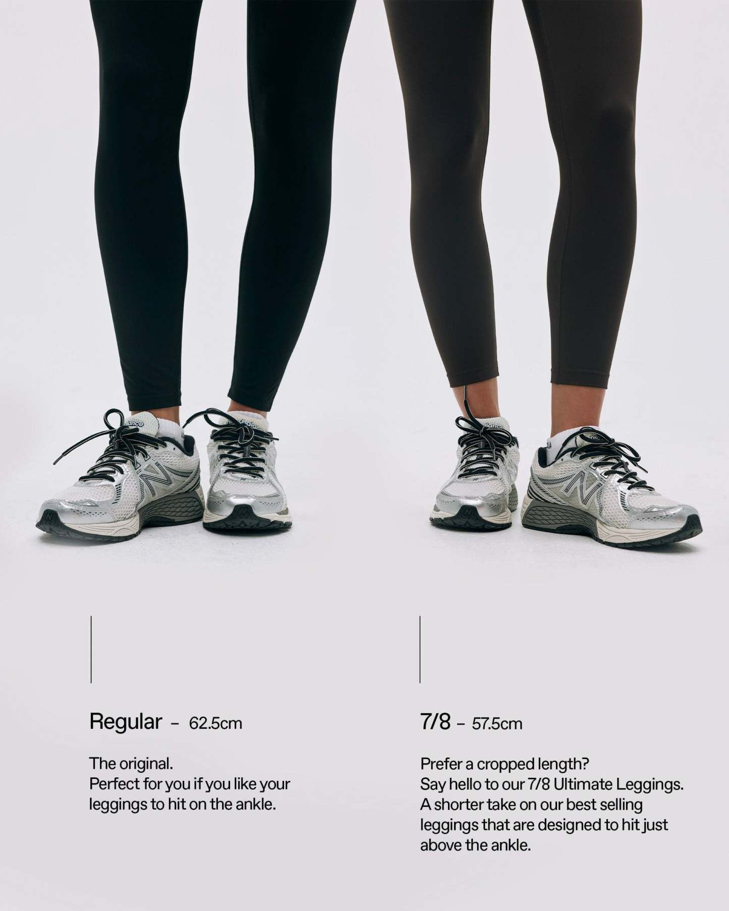 → 7/8 - 57.5cm. Prefer a cropped length? Say hello to our 7/8 Ultimate Leggings. A shorter take on our best selling leggings that are designed to hit just above the ankle.